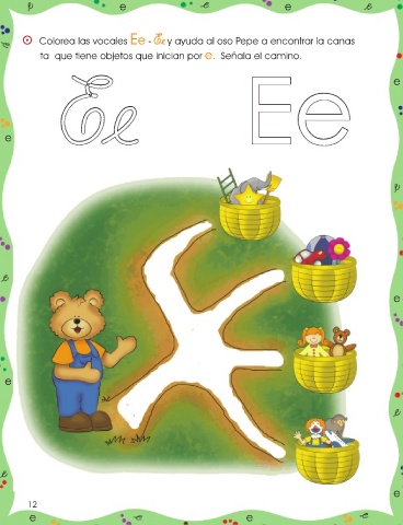 e e ⵙ Colorea las vocales Ee - Ee y ayuda al oso Pepe a encontrar la canas ta que tiene objetos que inician por e. Señala el camino. Ee Ee e e e e e 12 e e