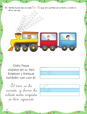 e e ⵙ Retiñe todas las vocales Ee - Ee que encuentres en el texto y canta a ritmo de rap. e e Osito Pepe e viajaba en su tren Esteban y Enrique también van con él. e El tren se ha varado, y humo ha echado ositos enojados se han regresado. e 14 e e