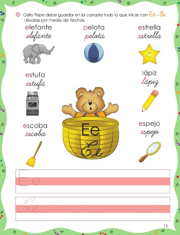 e e ⵙ Osito Pepe debe guardar en la canasta todo lo que inicie con Ee - Ee. Llévalas por medio de flechas. elefante pelota estrella elefante pelota estrella e e estufa lápiz estufa lápiz escoba Ee espejo escoba espejo e e e 15 e e