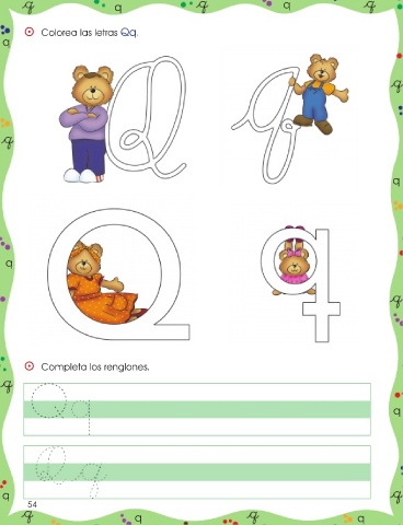 q q ⵙ Colorea las letras Qq. q q q ⵙ Completa los renglones. q q 54 q q