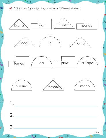 r r ⵙ Colorea las figuras iguales, arma la oración y escribelas . r Diana dos de donas sopa la toma r Tomas da pide a Papá r Susana tomate mano 1. r 2. 3. r 63 r r