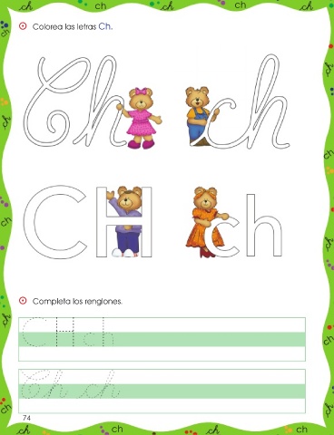 ch ch ⵙ Colorea las letras Ch. ⵙ Completa los renglones. 74 ch ch