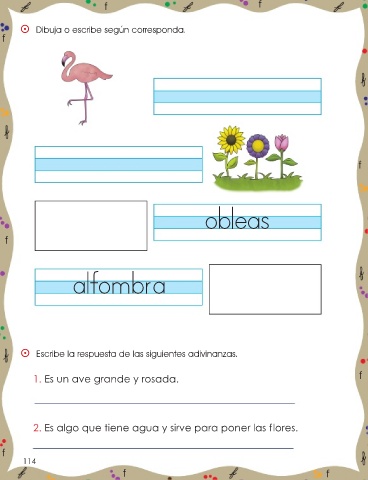 f f ⵙ Dibuja o escribe según corresponda. f f obleas f alfombra ⵙ Escribe la respuesta de las siguientes adivinanzas. 1. Es un ave grande y rosada. f 2. Es algo que tiene agua y sirve para poner las flores. f 114 f f