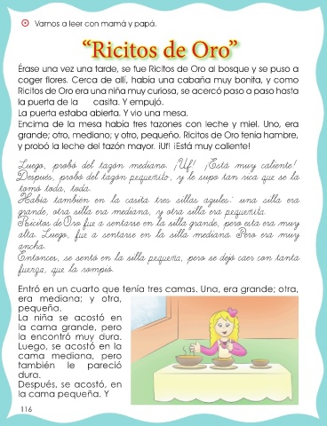 grande; otro, mediano; y otro, pequeño. Ricitos de Oro tenía hambre,