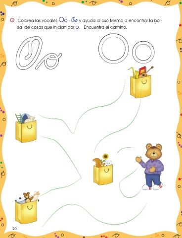 o o o ⵙ Colorea las vocales Oo - Oo y ayuda al oso Memo a encontrar la bol- Oo sa de cosas que inician por o. Encuentra el camino. o o o o 20 o o