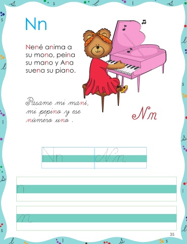 s l Nn s Nené anima a su mono, peina su mano y Ana suena su piano. s Pasame mi maní, mi pepino y ese NnNn l número uno . l s 35 l s