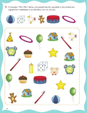 ⵙ El payaso “Plim Plim” tiene una presentación ayúdale a encontrar los siguientes materiales y enciérralos con un círculo. 4