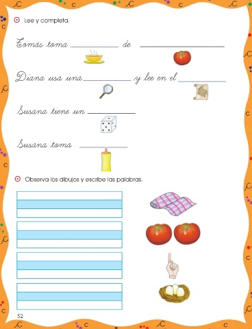 c c ⵙ Lee y completa. c Tomás toma de Diana usa una y lee en el Susana tiene un c Susana toma c ⵙ Observa los dibujos y escribe las palabras. c c 52 c c