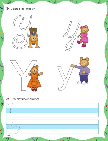 y y ⵙ Colorea las letras Yy. y y y ⵙ Completa los renglones. y y 68 y y